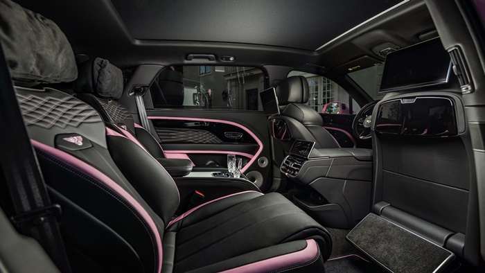 Untuk model istimewa pelanggan ini, kepakaran pasukan Mulliner, visi pelanggan dihidupkan menggunakan Candy Pink dan Blackline Specification memberikan kontras kontemporari dengan bahagian luar kereta. Pemegang pintu, paip ekzos ekzos, bezel lampu, matriks dan jeriji bawah, rel bumbung dan lubang sayap semuanya dikemaskan dalam warna hitam berkilat, dengan kaca privasi belakang berwarna melengkapkan rupa luaran yang dramatik.