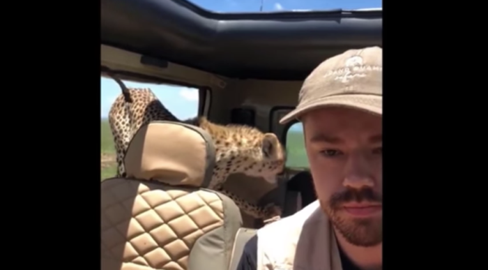 Sekumpulan pelancong berdepan detik cemas apabila seekor cheetah masuk ke dalam Toyota Land Cruiser mereka.
