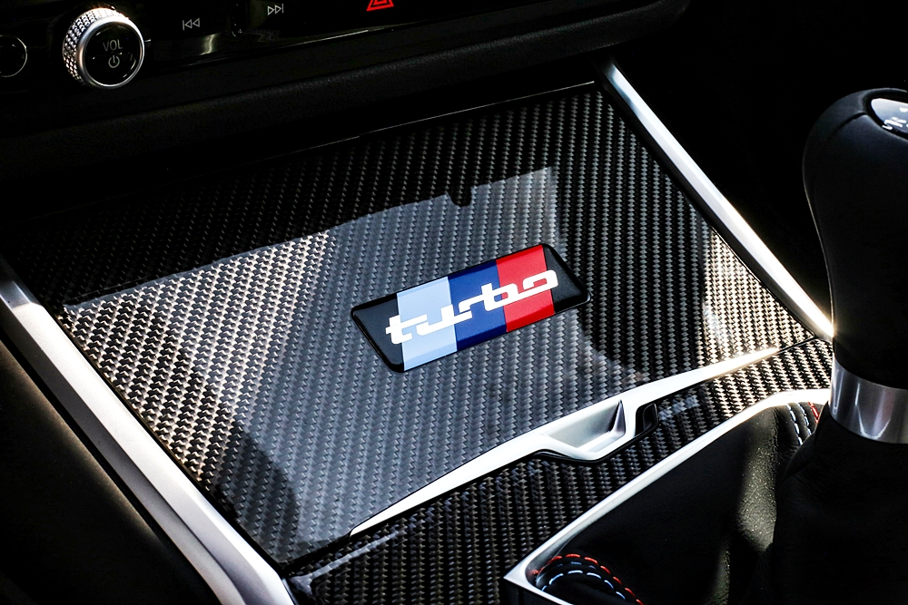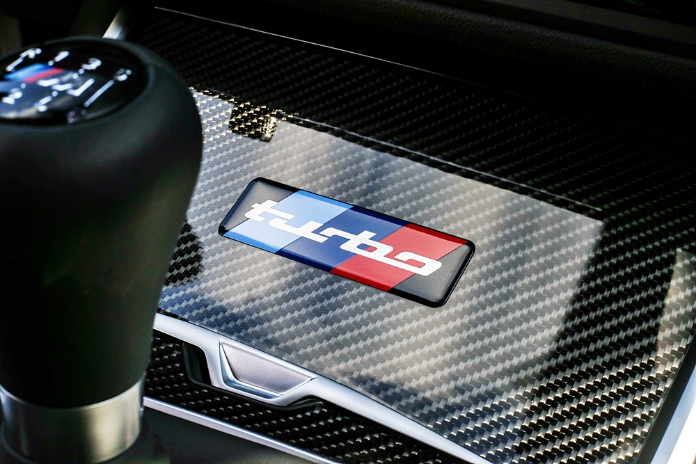 Bahagian atas power dome hud diwarnakan hitam dengan tulisan turbo terbalik. Sambungan visual jalur tiga warna ini turut diteruskan pada panel bumbung Gentian Karbon M (M Carbon) standard.