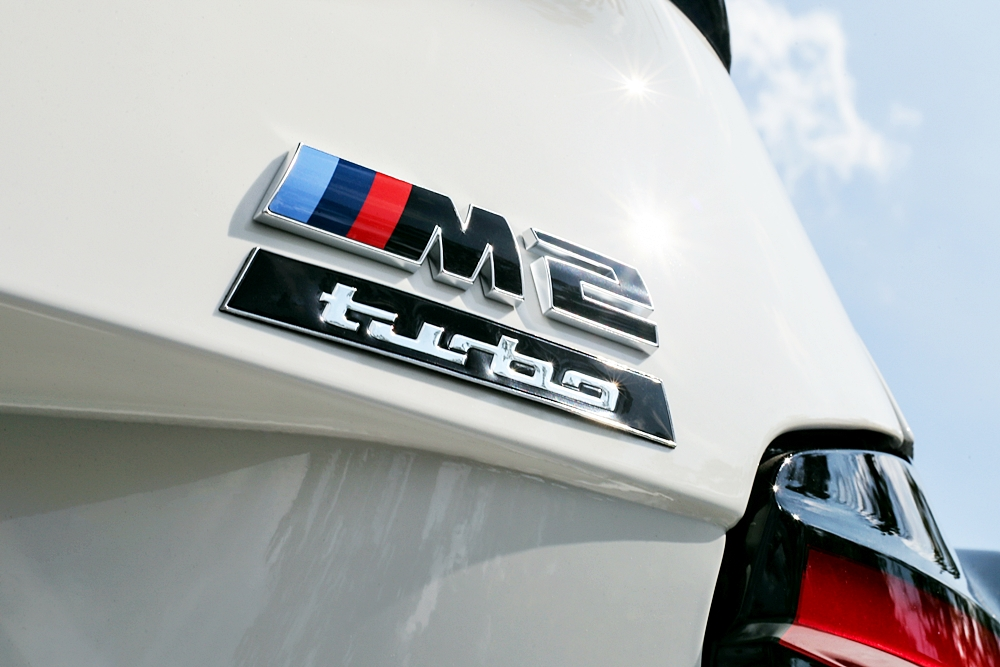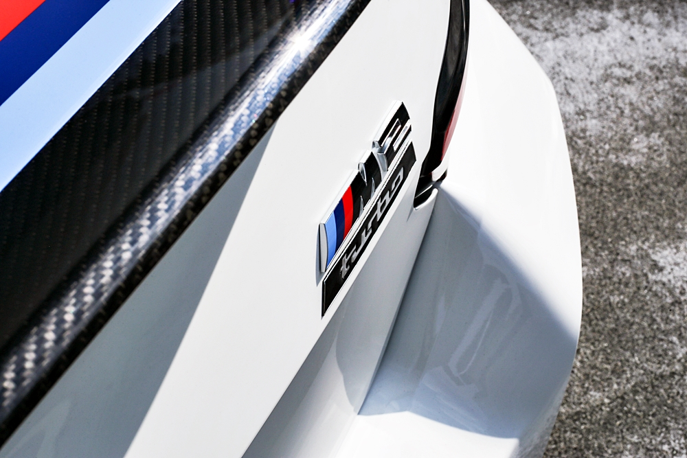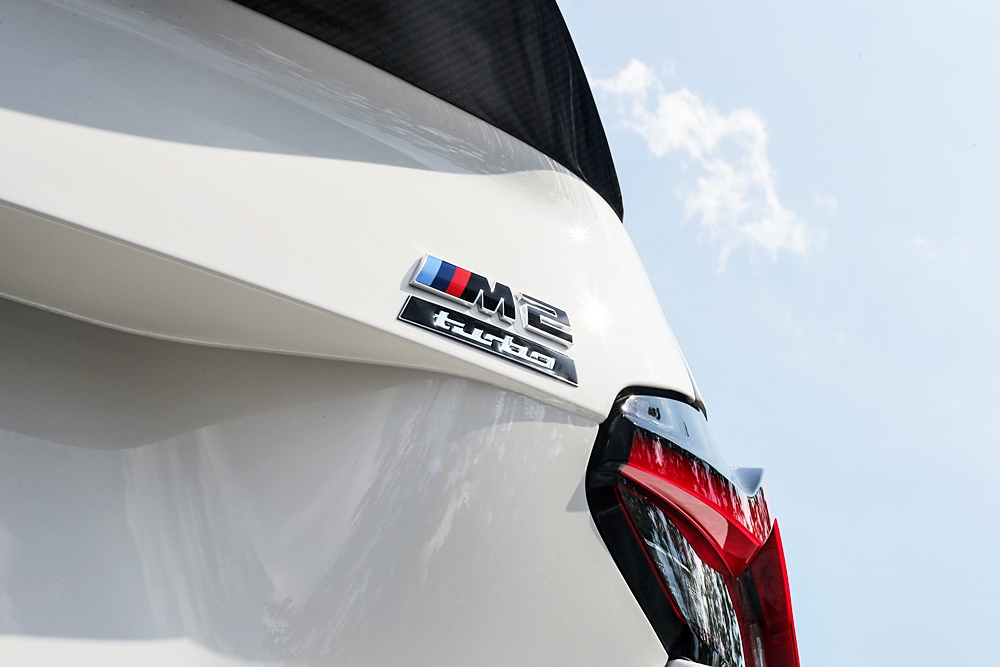 Spoilier belakang gentian karbon dari BMW M Performance yang dipasang pada bonet, serta lencana turbo unik di bahagian belakang, melengkapkan penampilan klasik.