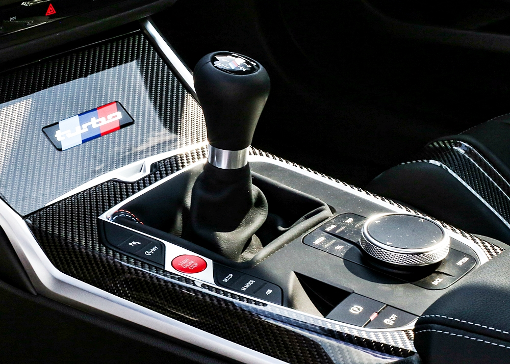 Plat yang tertera tulisan turbo di atas latar belakang jalur M diletakkan di hadapan tuil penukar gear.
