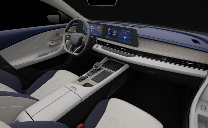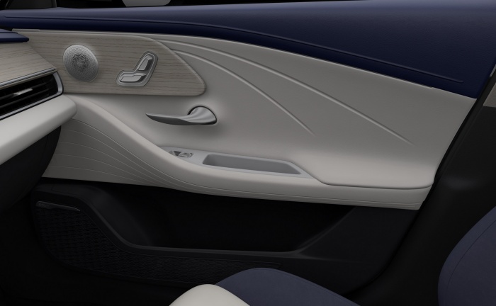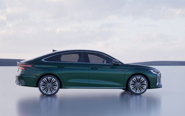 Rekaannya memang tipikal sebuah sedan enjin pembakaran dalaman dengan grill besar, lampu LED depan belakang, kemasan krom dan garis bumbung yang menurun.