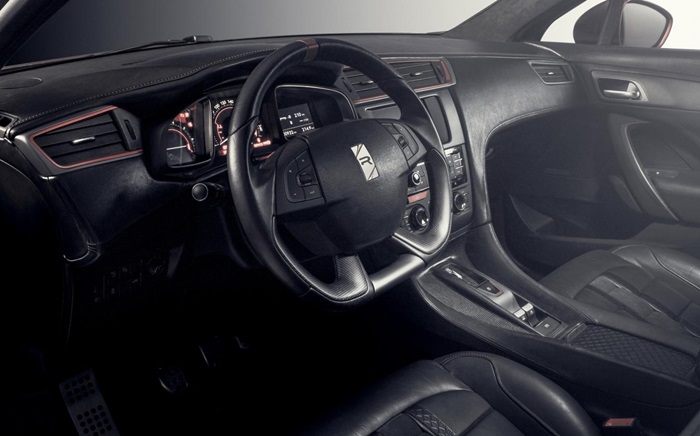 Bahagian dalaman Citroen DS 5LS R menyerlahkan kemewahannya melalui pelbagai material berkualiti tinggi. Antaranya ialah papan pemuka dan stereng yang dibalut dengan kulit Alcantara®. Tempat duduk, papan pemuka dan perehat tangan pula mempunyai kemasan jahitan merah.