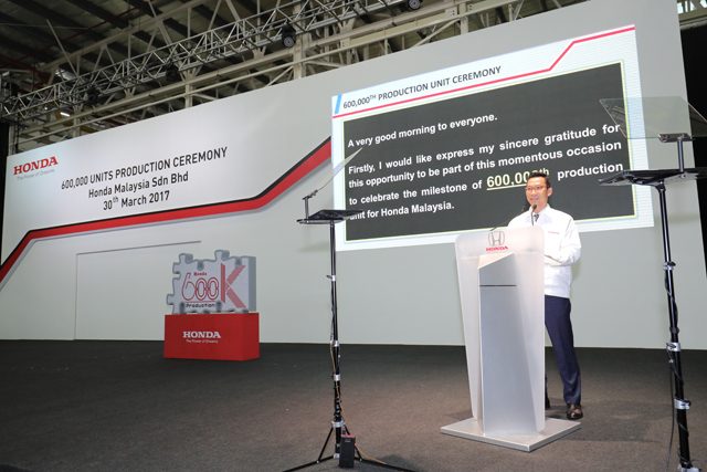 Honda Malaysia hari ini meraikan pencapaian bersejarah apabila kilangnya di Pegoh, Melaka mencatat pengeluaran yang ke-600,000 unit. Dalam majlis yang sama, Honda Malaysia turut mengumumkan pencapaian jualan 100,000 unit untuk tahun kewangan semasa (1 April 2016 – 31 Mac 2017), biarpun di sebalik situasi pasaran yang cukup mencabar tahun lalu.