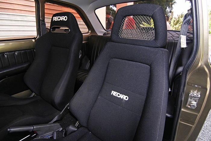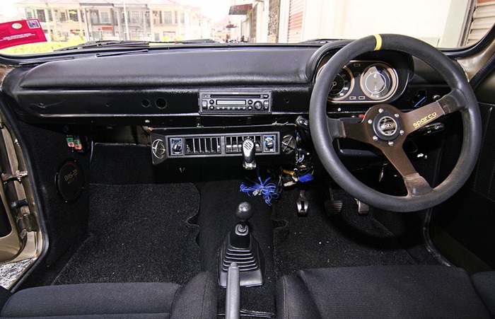 Bahagian dalaman pula dikemaskan semula dengan karpet baru berwarna hitam. Kulit pintu dibalut dengan vinyl hitam. Tempat duduk depan menggunakan sepasang Recaro model SR3 (pemandu) dan Fishnet untuk penumpang.