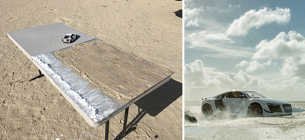 Hasilnya, audien tak akan terfikir langsung untuk meneliti foto Audi tadi tetapi lebih mengagumi ilusi efek awan, kabus, pasir dan asap yang digunakan.