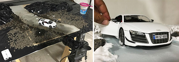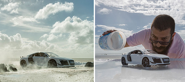 Jadi, inilah imej yang anda nampak di sebalik kreativiti yang digunakan. Rodriguez menggunakan miniatur R8 yang dibelinya berharga RM200 dan mula menyusun propsnya supaya R8 tadi hidup dalam suasana persekitaran foto itu sendiri.