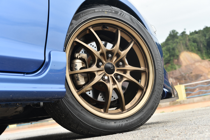 Begitu juga dengan sistem hentian yang menerima sepasang kaliper brek Mugen di bahagian depan beserta rotor dari Project MU. Sebagai pelengkap, bahagian roda diisi rim Mugen MF10 berukuran 17-inci, sebelum disaluti tayar gigit Bridgestone Potenza bersaiz 225/45ZR-17 setiap satu.