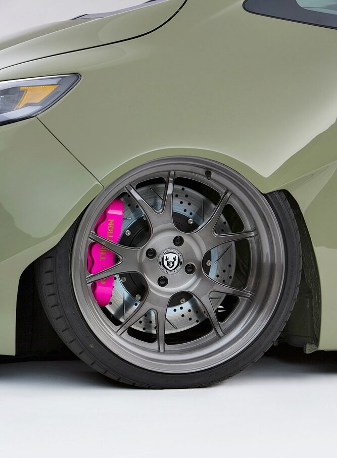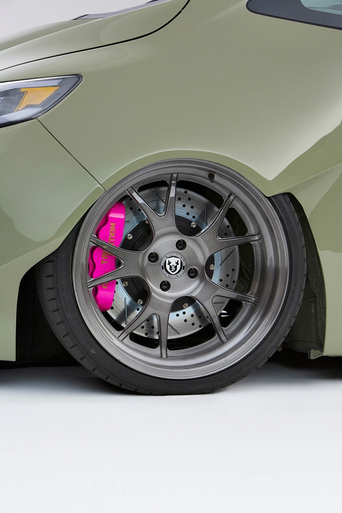 Di sebalik tayar ialah brek depan besar Baer dengan angkup enam omboh dalam warna Hot Pink Kylie Tjin Edition. Cakera digunakan saiz 14 inci dengan braket dan talian brek dari Unique Fabrication.