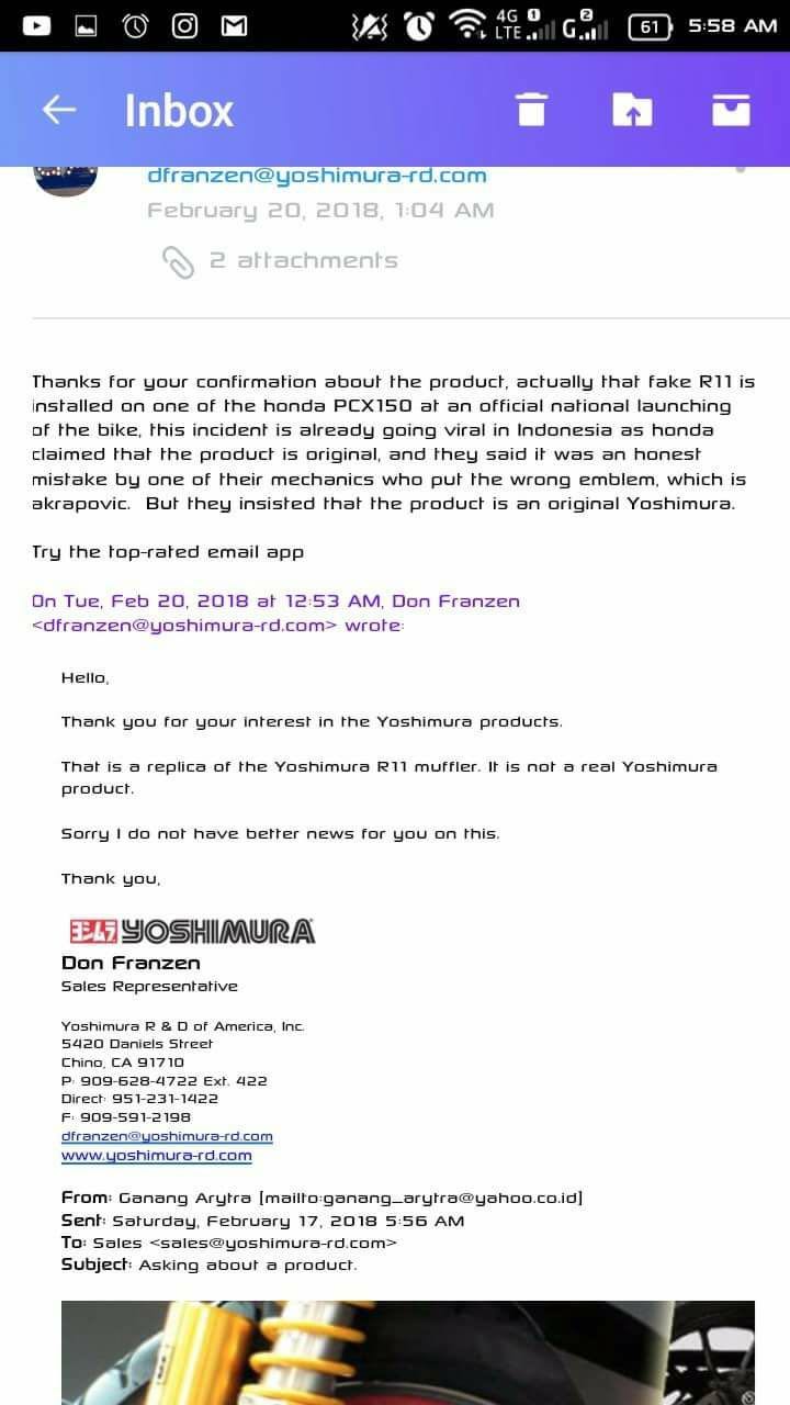 Salah seorang pembaca di sana Ganang Arytra telah menghantar email kepada pihak Yoshimura sendiri untuk mendapatkan pengesahan status ekzos Yoshimura yang digunakan oleh AHM pada PCX tersebut.