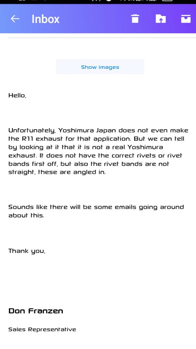 Pihak Yoshimura Amerika menerusi wakil mereka Don Franzen memberitahu bahawa ekzos Yoshimura R11 adalah palsu dan bukan produk mereka.