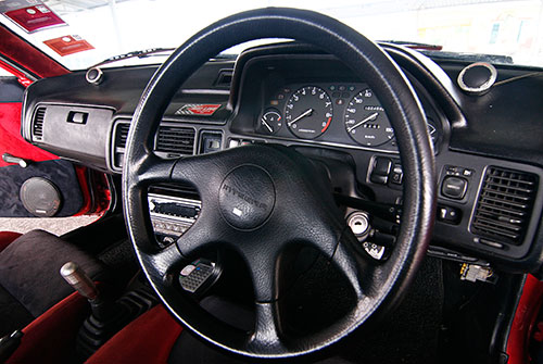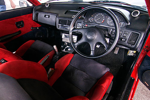 Bahagian dalaman kereta tidak nampak langsung macam kereta zaman awal industri automotif Jepun. Semuanya merah menyala bila tempat duduk dan panel dalamnya dibalut dengan fabrik hitam merah. Papan pemukanya kalau saya tidkak silap diambil daripada model DA6 Integra.