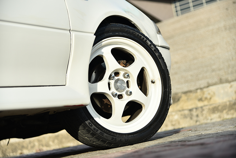 Selari dengan perubahan luaran, ruang roda kini dihiasi rim replika Spoon bersama tayar Achilles ATR Sport berukuran 16-inci. Sistem brek masih lagi standard, kecuali tebukan liang-liang udara di bahagian rotornya. Kedudukan kereta kemudian direndahkan dengan set spring dari H&R, termasuk padanan penyerap hentak Ohlins dan Razo.