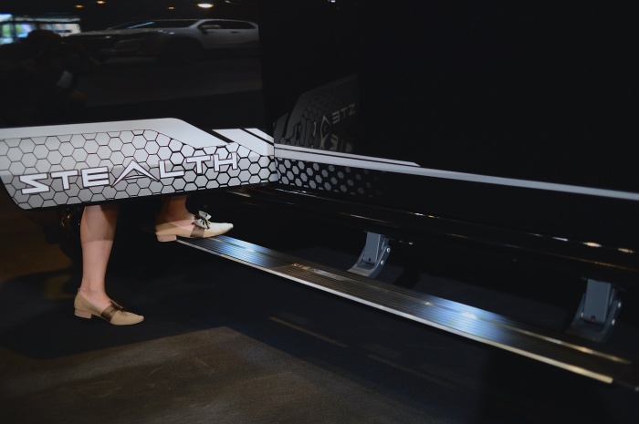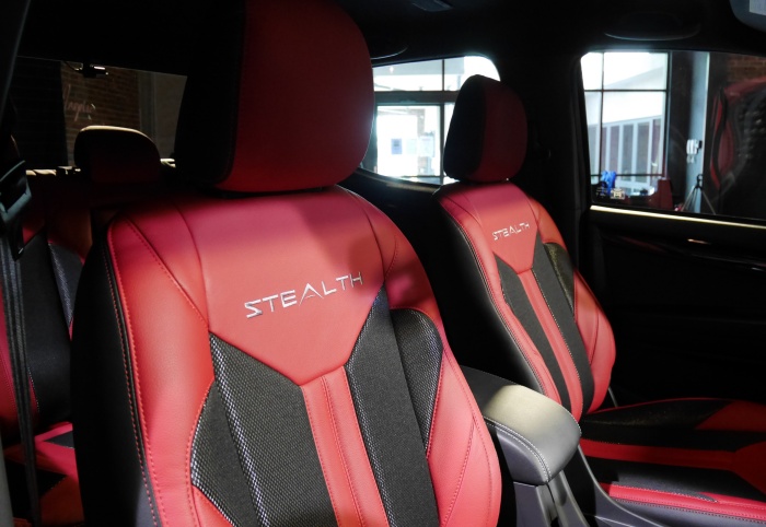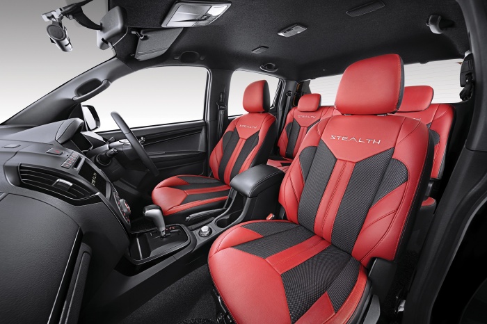 - Ruang kabin diserlahkan dengan tempat duduk dibalut kulit dan fabrik berwarna merah hitam. Jahitan logo Stealth juga membuatkannya lebih eksklusif.