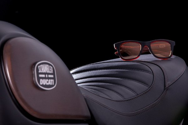 Pelana kemasan kulit disepadankan dengan kaca mata Ducati Scrambler yang akan ditawarkan di butik Italia Independent.