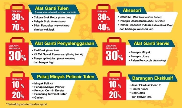 Diskaun sebanyak 30 hingga 70 peratus akan diberikan kepada alat-alat ganti tulen. Antaranya termasuklah rotor cakera brek, pad brek, penggilap cermin dan banyak lagi.