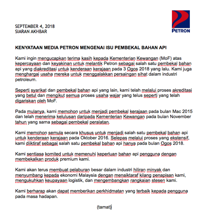 Selepas berdiam diri beberapa ketika, Petron hari ini menghantar satu kenyataan rasmi bagi memberi penjelasan sewajarnya. Berikut adalah kenyataan akhbar tersebut: