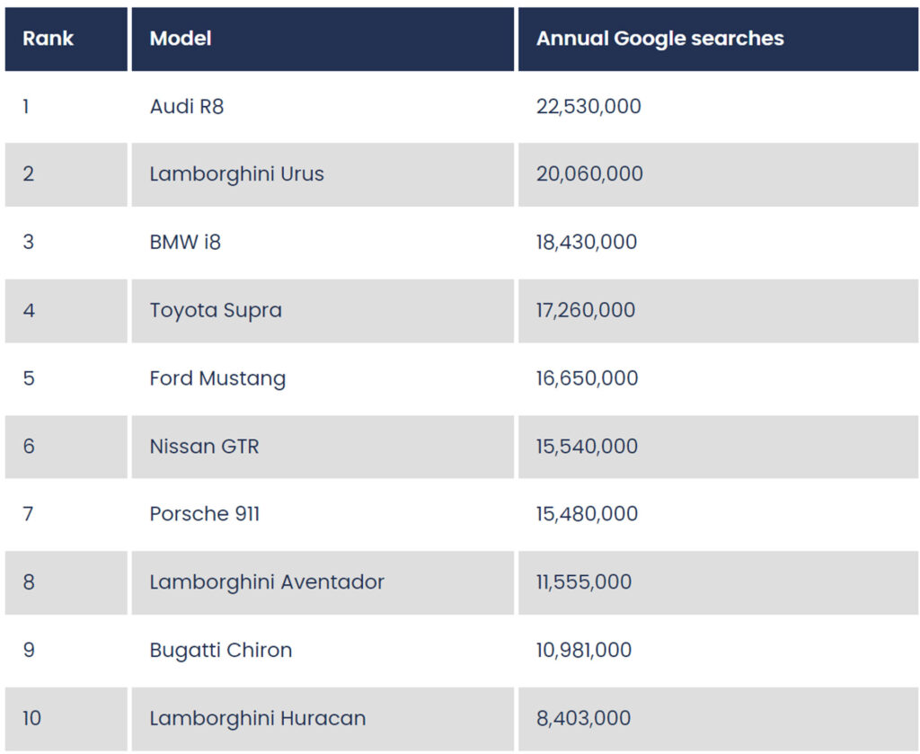Mengagumkan apabila Audi R8, yang tidak dikeluarkan sejak sekian lama telah dicari sebanyak 22.53 juta kali. Manakala Lamborghini Urus mengikut rapat dengan 20.06 juta carian walaupun ia adalah SUV. Namun, popularitinya membuktikan betapa bijaknya Lamborghini menceburi dunia SUV.