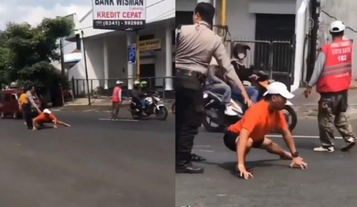 Aksi itu dilakukan di tengah-tengah jalan raya yang sibuk dengan kenderaan lalu-lalang. Di samping lelaki tersebut, terdapat seorang anggota polis terpaksa mengawal lalu lintas yang menjadi sesak disebabkan lagak pelik lelaki berkenaan.