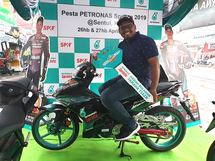 Sahrulnaim bin Sahrahan berasal dari Gombak, Kuala Lumpur yang merupakan pemenang pertama bulan Mac YAMAHA Y15ZR berkata,” Saya amat bersyukur dan berterima kasih kepada PETRONAS Sprinta kerana menganjurkan peraduan yang sangat menarik ini. Saya yang kebetulan memang harus menukar minyak pelincir membeli produk F500 untuk kegunaan motor kapcai saya. Memang menjadi kebiasaan, minyak pelincir PETRONAS Sprinta akan menjadi pilihan saya kerana terbukti membuat enjin saya terasa lebih ringan dan lancar”.