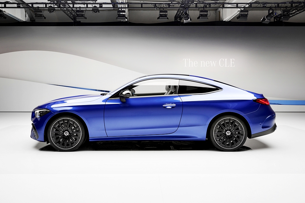 Bahagian sisi menyerlahkan keanggunan CLE, jarak roda panjang dan roda depan jauh ke depan dan bonet nampak panjang. Imej tersebut membayangkan model klasik Mercedes-Benz.