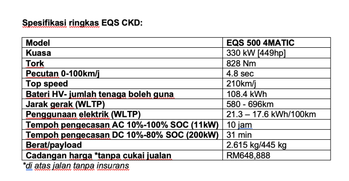 EQS 500 4MATIC menjadi saloon mewah pertama dipasang di Malaysia. Hadir dalam satu varian sahaja, spesifikasi ringkas jentera itu adalah seperti berikut:
