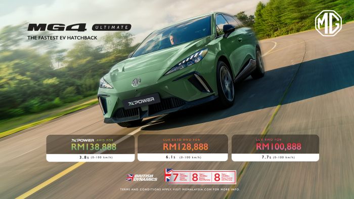 MG4 kini boleh dimiliki pada harga bermula RM100,888 untuk varian Lux, RM128,888 untuk Lux Extended, dan RM138,888 untuk versi berprestasi tinggi XPower.
