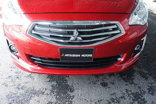 Penampilan luaran Attrage memang mirip dengan Concept G4. Elemen moden sedan itu terserlah menerusi gril radiator berwarna krom bersama logo tiga bentuk berlian di atasnya.