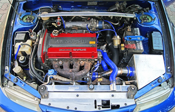 Baiklah, benda pertama yang dibuat sudah tentu menjadikannya Evo tulen adalah dengan menyalin enjin 4G63 lagenda itu. Kepala selinder kemudiannya diport dan polish, cam pulley dan cam HKS 272 dimasukkan dan turbin TD06 225 dipasang.