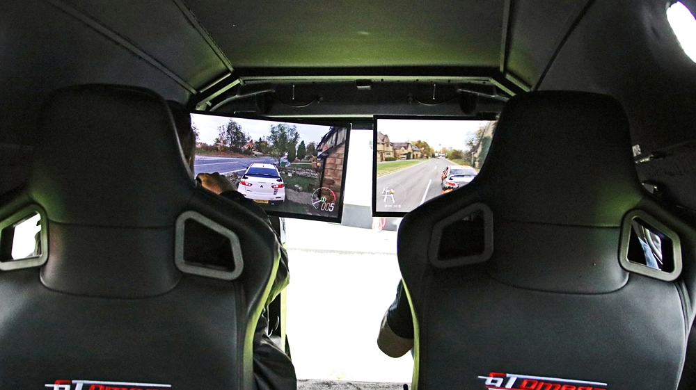 Setiap satu daripada dua simulator lengkap dengan kerusi lumba dan stereng Logitech G920 Driving Force Racing, kotak pedal dan tombol gear.