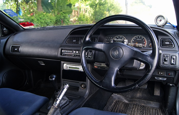 Di bahagian dalam, Man mengekalkan kebanyakan peralatan asal, kecuali tempat duduk depan yang diganti dengan tempat duduk bucket Recaro. Aksesori lain yang Man layan ialah meter RSM A’PEXi dan meter boost A’PEXi EL generasi pertama, serta pengawal boost Blitz SBC. Oh ya! Tak lupa, stereng Skyline R32 disalin untuk dipadankan dengan papan pemuka standard Cefiro.