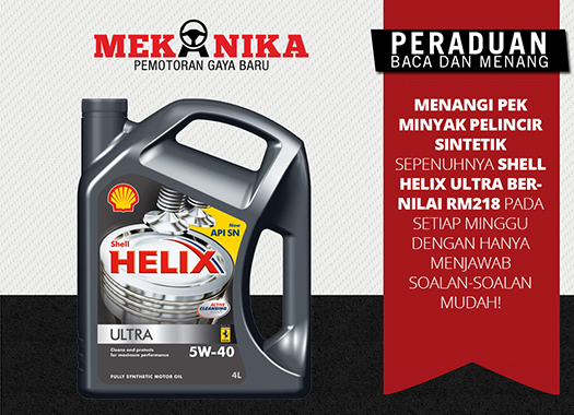 Hadiahnya? Pek minyak pelincir sintetik sepenuhnya Shell Helix Ultra empat liter bernilai RM218. Peraduan ini akan berlangsung selama empat minggu dengan dua pek minyak pelincir dihadiahkan pada setiap minggu.