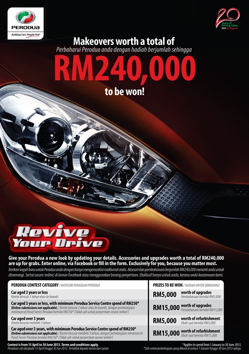 Berita baik untuk anda yang memandu kenderaan Perodua. Ini kerana, sempena ulangtahun ke-20 Perodua, pembuat kereta kompak itu kini menganjurkan peraduan yang diberi nama “Revive Your Drive”.
