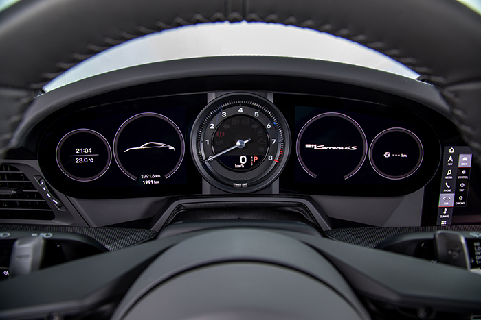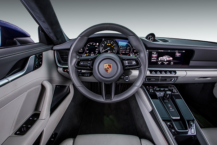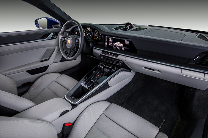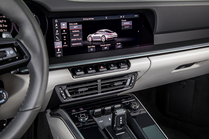 Bahagian dalamannya dilengkapi dengan monitor 10.9 inci diintegrasikan bersama Porsche Communication Management (PCM). Tidak seperti kereta-kereta moden yang dihiasi gadget dan skrin digital di sana sini, kereta ikonik ini masih menggunakan dial tradisional mengekalkan imej tradisinya.