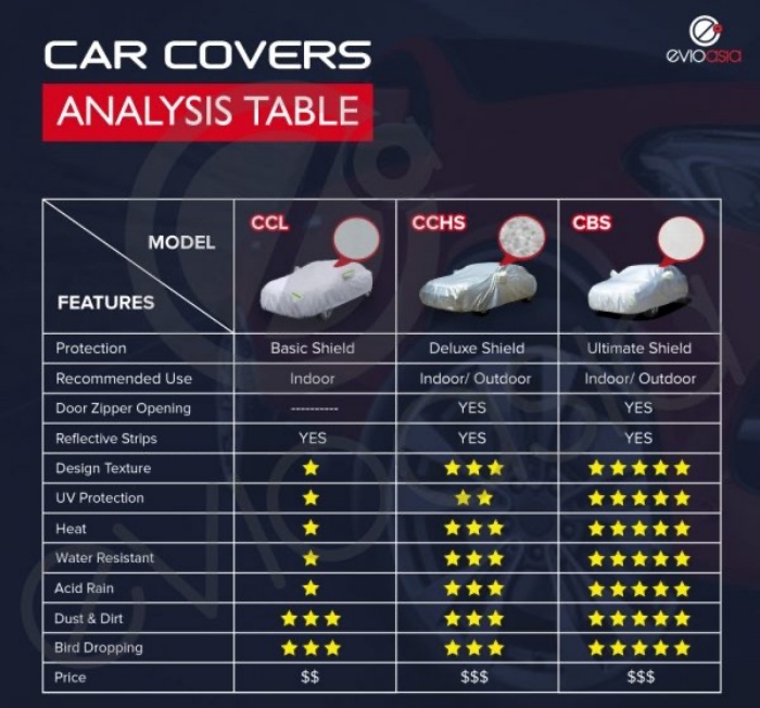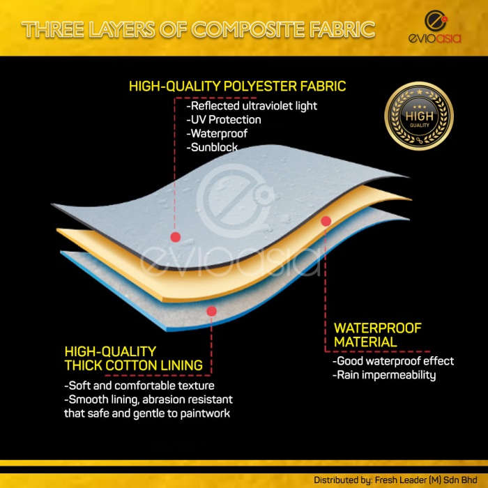 Pelindung kereta EVIO ASIA ini istimewa kerana ia diperbuat daripada tiga lapisan fabrik komposit yang berfungsi menghalang vahaya ultraviolet, UV, kalis air, tahan lasak dan tidak akan menjejaskan cat kereta.