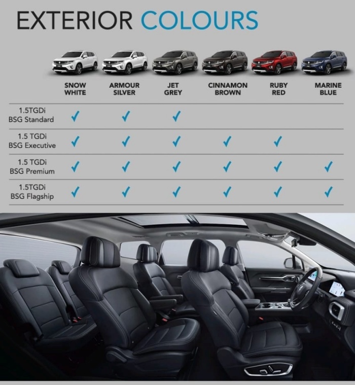 Terdapat 6 warna yang akan ditawarkan nanti dan boleh dipilih oleh bakal pembeli. Antara pilihan warna yang disediakan termasuklah Snow White Armour Silver, Jet Grey, Cinnamon Brown, Ruby Red dan juga Marine Blue. Hanya varian Premium dan Flagship sahaja yang ditawarkan dengan 6 pilihan warna. Anda boleh membuat tempahan sekarang di pusat jualan Proton sah berdekatan dengan anda.