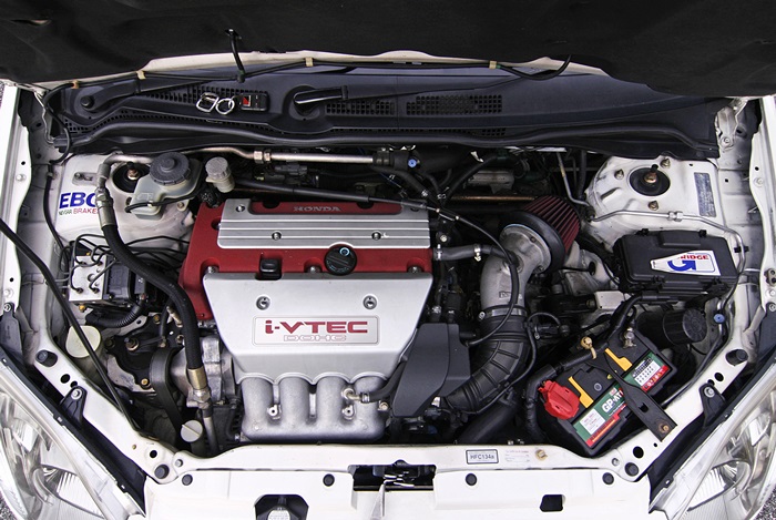Enjin K20A dalam keadaan asal. Dipasang dengan spark plug Iridium dan ECU Hondata K Pro. Ekzosnya yang tak nampak sebab manifold K di belakang ialah manifold Toda yang dipasang lengkap dengan set ekzos J’S Racing 70RR. Pelapik klac kereta pemilik lama dah pasangkan dengan Ogura Single Plate.