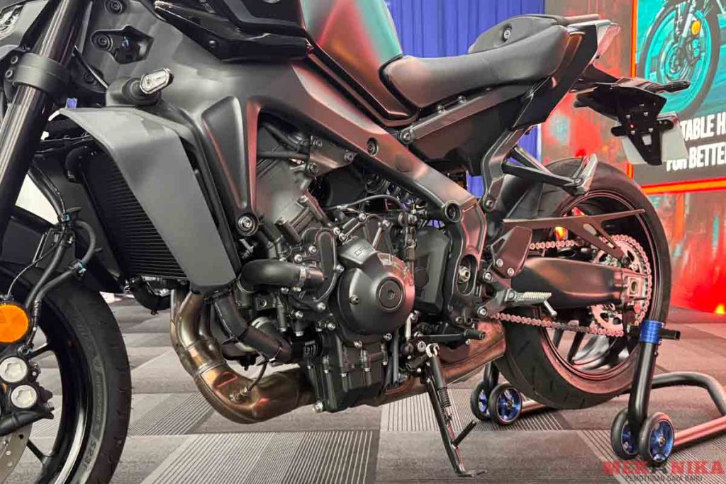 Yamaha MT-09 2024 ini masih lagi dikuasakan enjin CP3 tiga silinder 890cc dengan sistem penyejukan cecair yang menghasilkan 119hp dan 93Nm @ 7,000rpm. ‘Bore’ dan ‘stroke’ kekal 78.0mm x 62.1mmdengan nisbah mampatan 11.5:1.