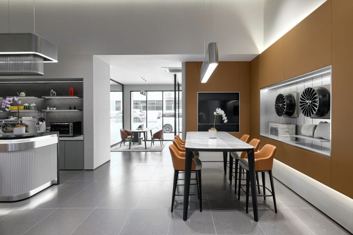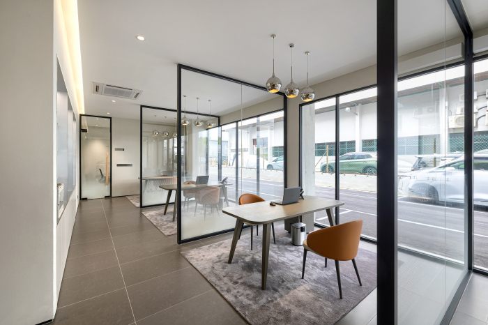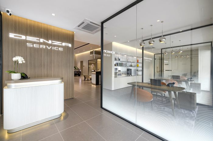 Reka bentuk bilik pameran Denza Glenmarie memancarkan gabungan kemewahan moden dan elemen lestari, sejajar dengan imej jenama yang menekankan inovasi serta gaya hidup hijau.