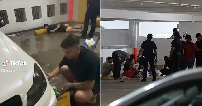 Ketika kejadian, seorang lelaki ditahan polis dalam keadaan tertiarap dengan tangannya diletakkan di belakang. Wajahnya disandarkan pada hentian roda tempat letak kereta tersebut.