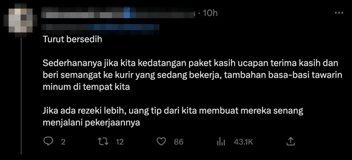 “Jika anda mempunyai rezeki lebih, berikan mereka tips untuk memudahkan kerja mereka,” tulis mereka.