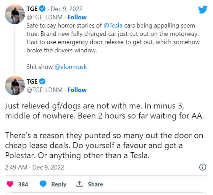 Meskipun dia mengatakan perkhidmatan pelanggan Tesla membantu, namun dia memberikan nasihat untuk orang yang ingin membeli EV, “Ada sebab mereka menolak begitu banyak tawaran pajakan murah. Bantu diri anda dan dapatkan Polestar, atau apa-apa sahaja selain Tesla.”