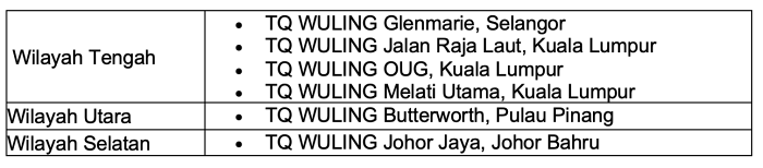 TQ WULING mempunyai 6 bilik pameran khusus di Semenanjung Malaysia dan 7 pusat servis selepas jualan melalui rangkaian servis Tan Chong yang sedia ada. Lebih banyak cawangan sedang dirancang bagi memastikan sokongan optimum kepada semua pelanggan.