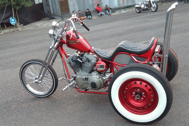 Trike kustom ini menggunakan sepasang fork hadapan jenis springer yang kemudiannya disudahkan dengan rim bersaiz 21 inci dan dibalut dengan tayar Avon Speedmaster. Tempat duduknya pula merupakan tempat duduk kustom yang dinamakan ‘King and Queen’ yang cukup selesa tetapi tidak menganggu tunggangan.