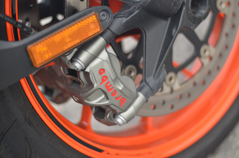 Kuasa yang besar tanpa kuasa brek yang mencukupi memang satu resepi bunuh diri. Super Duke ini dipasangkan dengan brek Brembo M50 dengap angkup 4-piston yang mampu menghentikan motosikal ini dengan hanya satu jari pada tuil brek.