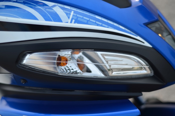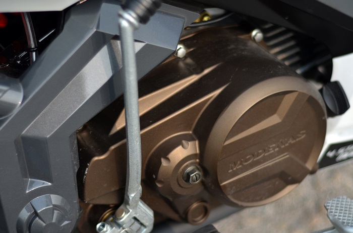 Bahagian sisinya tirus, bahagian depannya nampak macam ada pengaruh Yamaha LC135 dengan posisi lampu membelok pada bahagian ‘dada’. Itu mungkin pada pandangan saya sahaja. Kemasan kecil yang dibuat ialah penutup enjin dan klac berwarna tembaga, selari penghadang ekzos berwarna gangsa dan hitam.