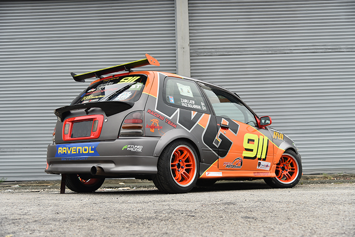 Walaupun berstatus trek, kereta ini takdelah rentung tak tentu pasal. Pemiliknya Zairi, masih mengekalkan hampir kesemua komponen luaran seperti kereta jalanan biasa. Standard pun dah ringan apa. Yang ditambah cuma arch roda kustom setebal 70mm serta unit spoiler GT di ruang belakang. Memastikan ia lebih menyerlah ketika beraksi, keseluruhan badan kereta telah dibalut dengan stiker rekaan kustom. Senang sket nak tacap.