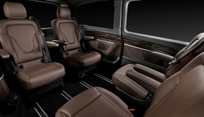 Tempat duduk V-Class menawarkan pelbagai konfigurasi untuk memenuhi apa jua kegunaan pemiliknya. Dalam setting standard, van ini dilengkapi empat kerusi individu yang mewah, lengkap bersama perehat tangan pada dua baris tempat duduk. Kerusi ini boleh dilipat untuk memudahkan urusan keluar masuk ke bahagian belakang.