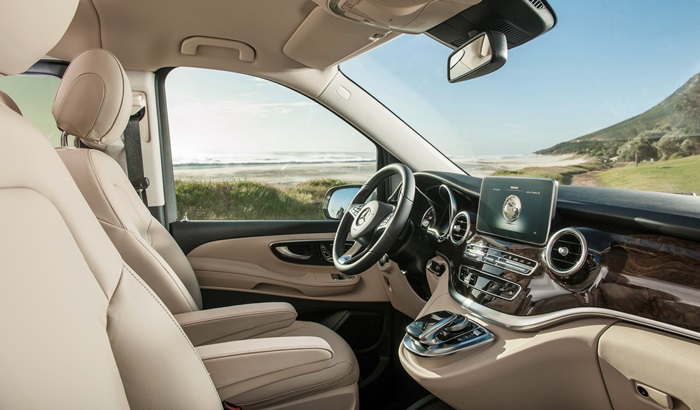 Bahagian kabin V-Class menawarkan pengalaman serba baharu. Ia bukan sahaja begitu senyap, malah penggunaan materialnya cukup berkualiti. Pemandu dan penumpang juga pasti terpegun dengan dua bahagian papan pemukanya.