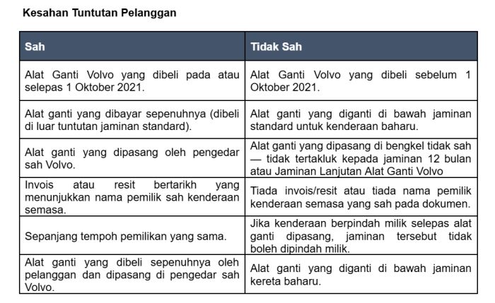 Untuk melayakkan diri dalam program ini, alat ganti perlu dibeli dan dipasang di pusat servis sah Volvo pada atau selepas 1 Oktober 2021 dengan invois sah sebagai bukti pemasangan.